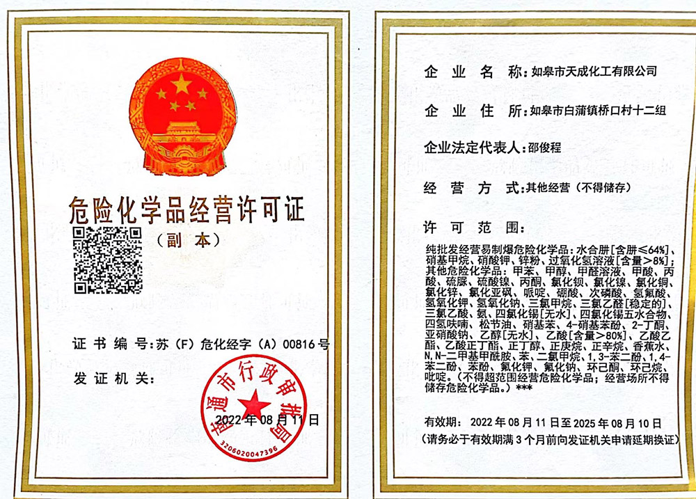 ? 如皋市天成化工有限公司創(chuàng)建于1996年。公司地處于美麗富饒的長江三角洲,座落在古鎮(zhèn)林梓,通揚(yáng)運(yùn)河河畔。南瀕長江、西臨204國道,距南通港、飛機(jī)場30公里,立體交通發(fā)達(dá)。公司經(jīng)營管理規(guī)范,技術(shù)力量雄厚,擁有一批高、中級專業(yè)技術(shù)人才。